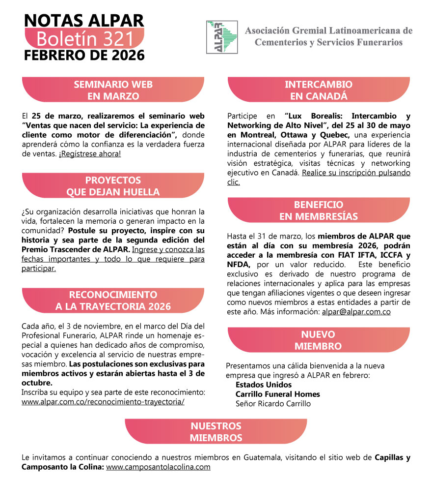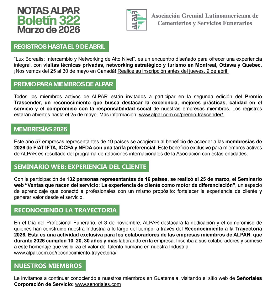Inicio► Notas ALPAR► Notas ALPAR Para visualizar el boletín animado pulse click sobre la imagen. Patrimonio Funerario Beneficios Reglamentaciones Libros especializados Código de Ética [/et_pb_column]